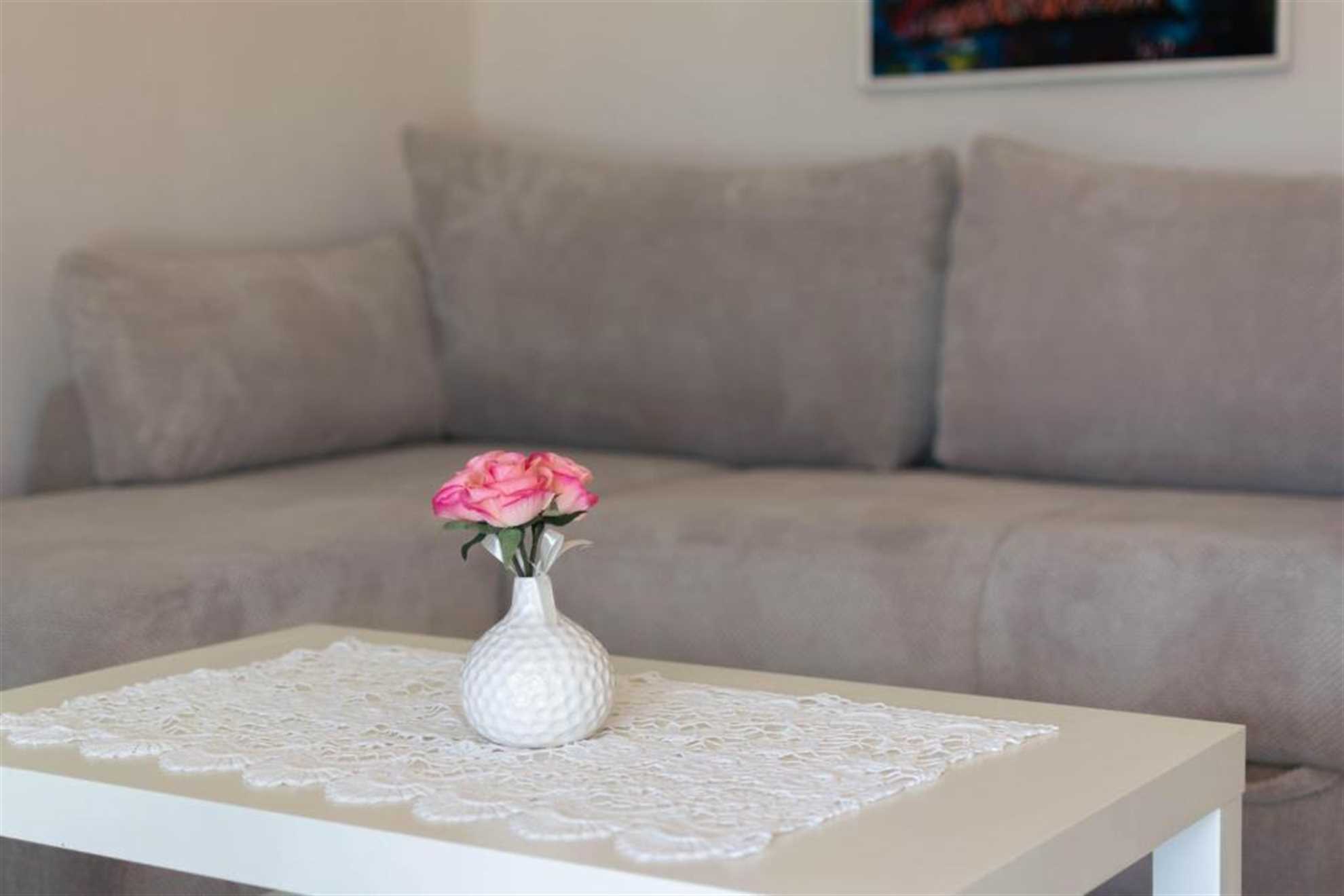 The apartment is 56 m2 and consists of a bright living room with a kitchen and dining area, a bedroom, a bathroom, and a balcony. The modern kitchen is equipped with an oven and other necessary tools for carefree living. The living room has a coffee table, and a sofa set that can be prepared as an additional bed if needed. The bedroom includes a double bed (180 x 200 cm) and two single beds (2 x 90 x 200 cm). The bathroom features a shower and bidet.