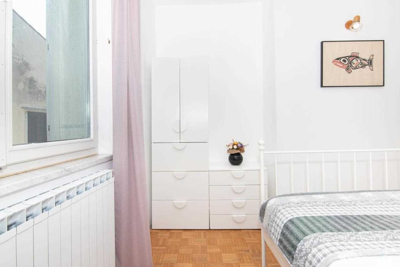 The spacious apartment is located on the third floor of an old townhouse and offers a beautiful view of the city. The size of the apartment is 90 m2. The floor plan includes two bedrooms, a bathroom, a living room, a kitchen, a dining room and two balconies. The first bedroom contains a double bed (180 x 200 cm), the second bedroom has a double bed (180 x 200 cm) and a single bed (90 x 200 cm). It is also possible to prepare a crib in the bedroom.