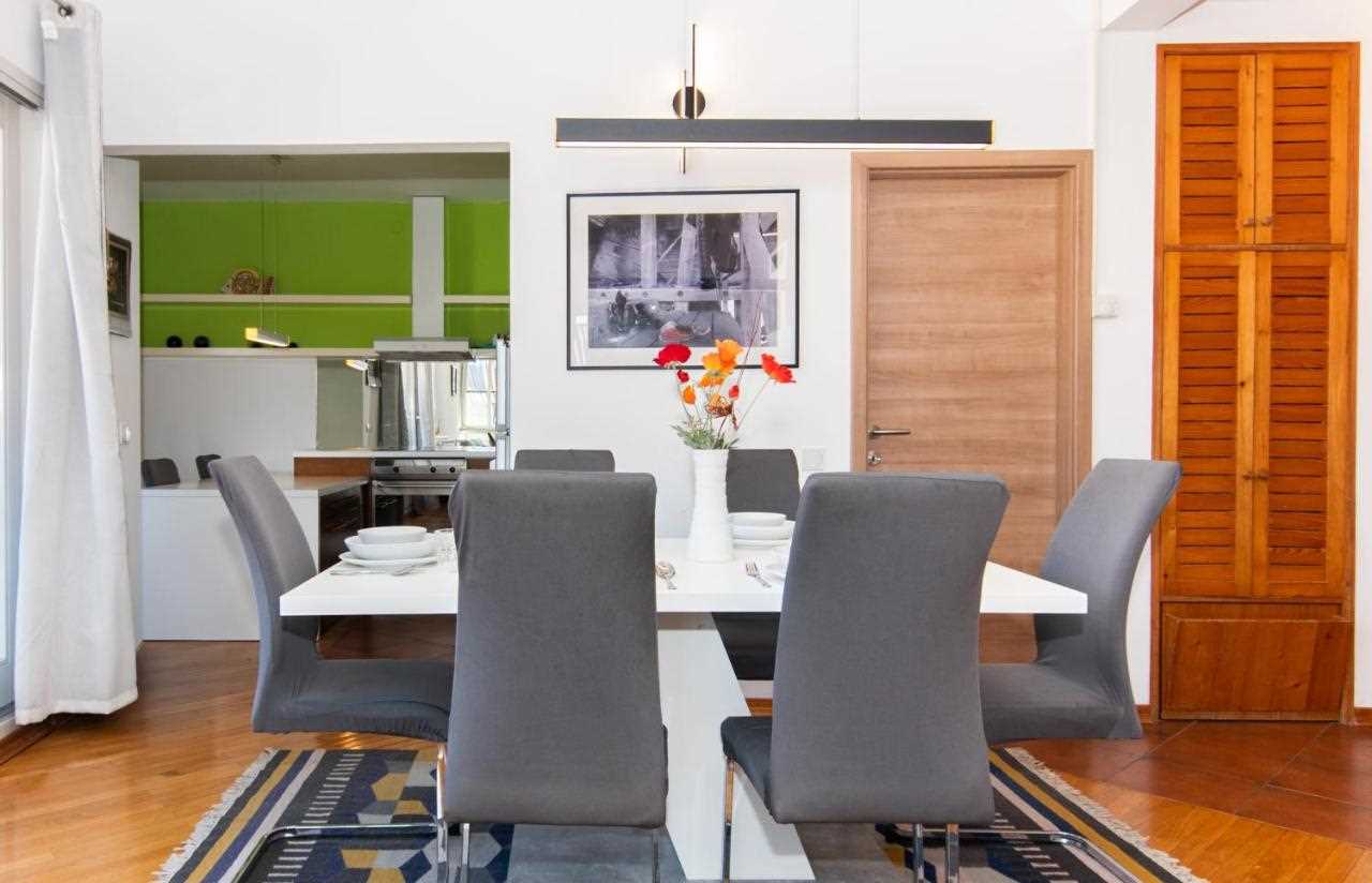 The bathroom is equipped with a shower cabin. In the living room there is a comfortable sofa set, a coffee table and a flat screen TV. The kitchen contains an oven, dishwasher, microwave, coffee maker and other household appliances. The kitchen counter is ideal for serving coffee or breakfast. For other meals, there is a dining table with comfortable chairs. The balconies contain a seating area.