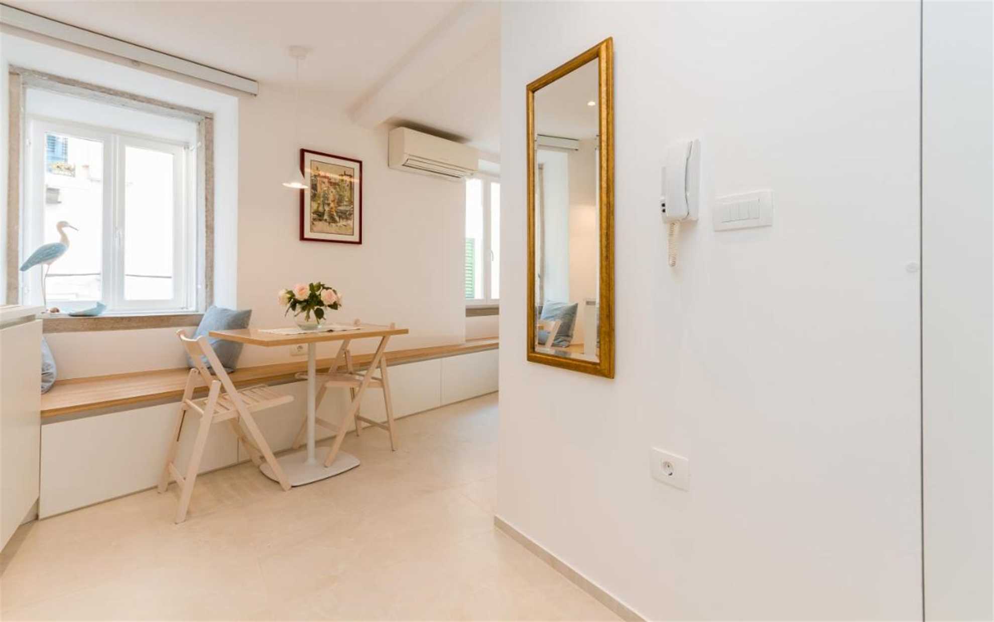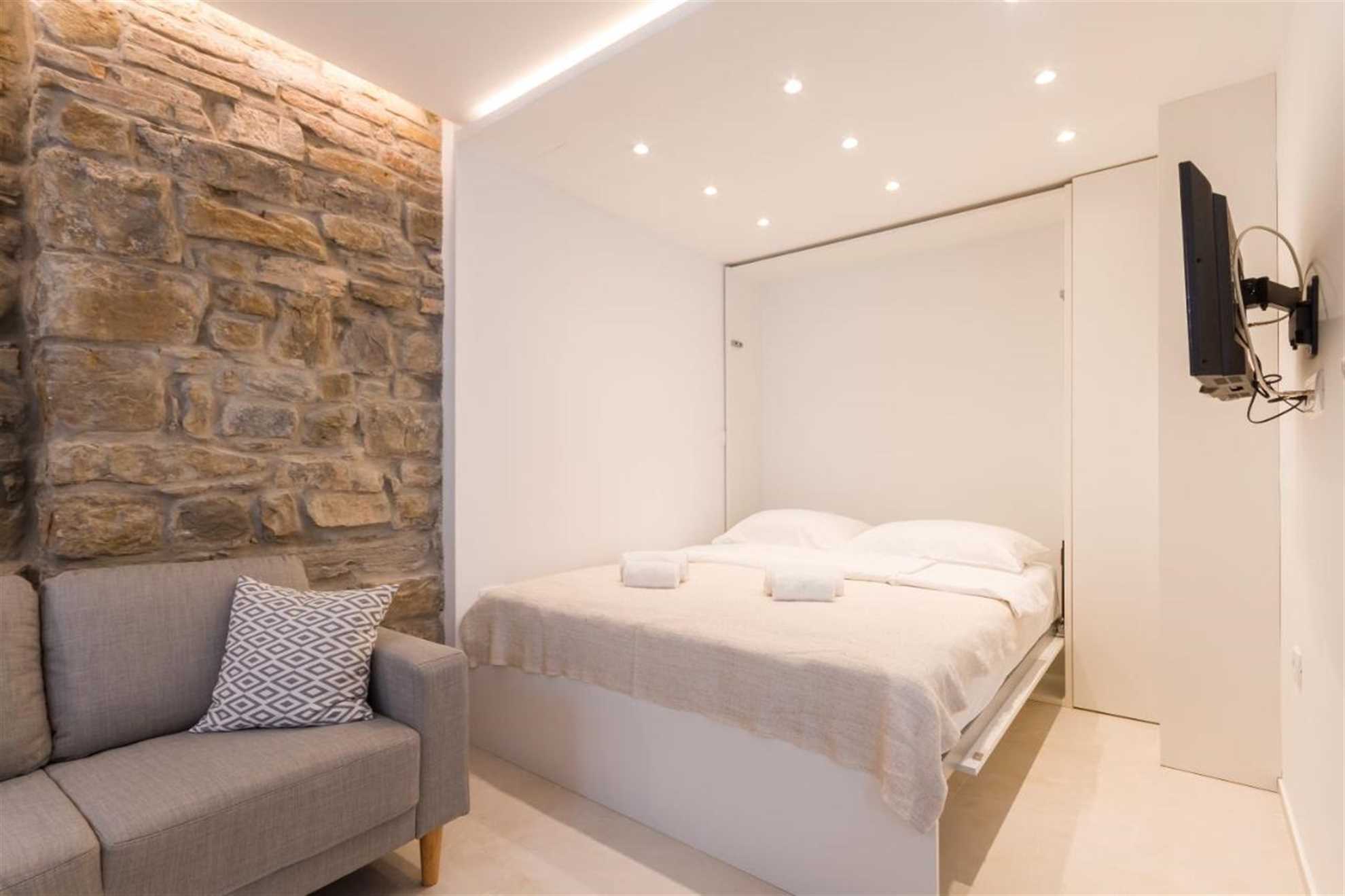 The apartment has a flat-screen TV. The sofa is next to Istrian stone wall, which gives the room special feeling. The renovated bathroom with modern ceramic tiles and a minimalist shower wall invites you to relax and pamer yourself. The window offers a view of the Piran stree. The air-conditioned apartment has Wi-Fi, fresh sheets, and towels available. The apartment can accommodate two people and is especially suitable for couples.