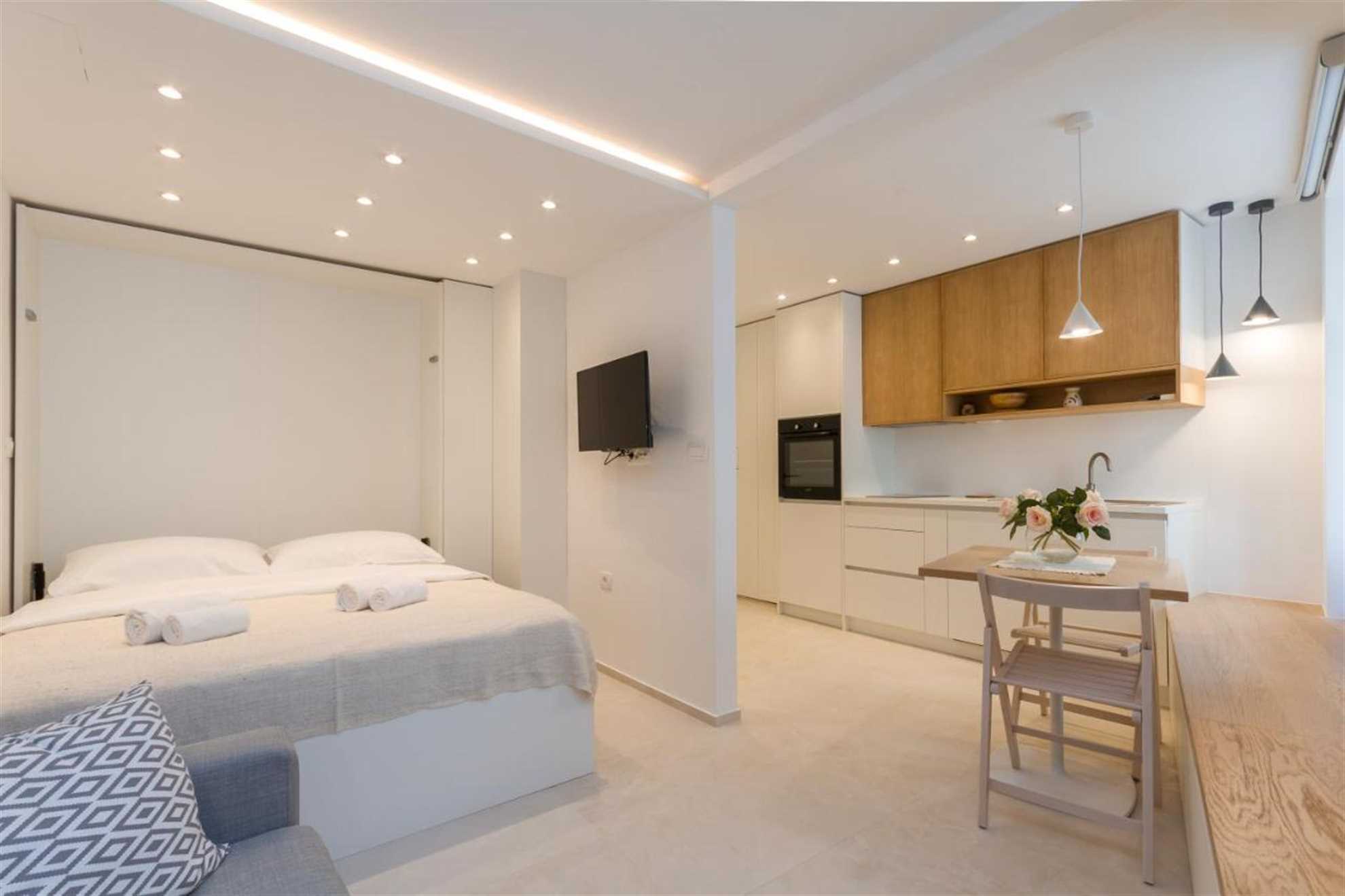 The studio is 20 m2 and includes a kitchen with a dining area, a sleeping area, a living area, and a bathroom. The modern light kitchen contains a dishwasher, coffee maker, and other necessary equipment for a carefree stay. The bedroom has a lift-up double bed (160 x 200 cm) that allows for functional use of space as it can be stored in the closet.