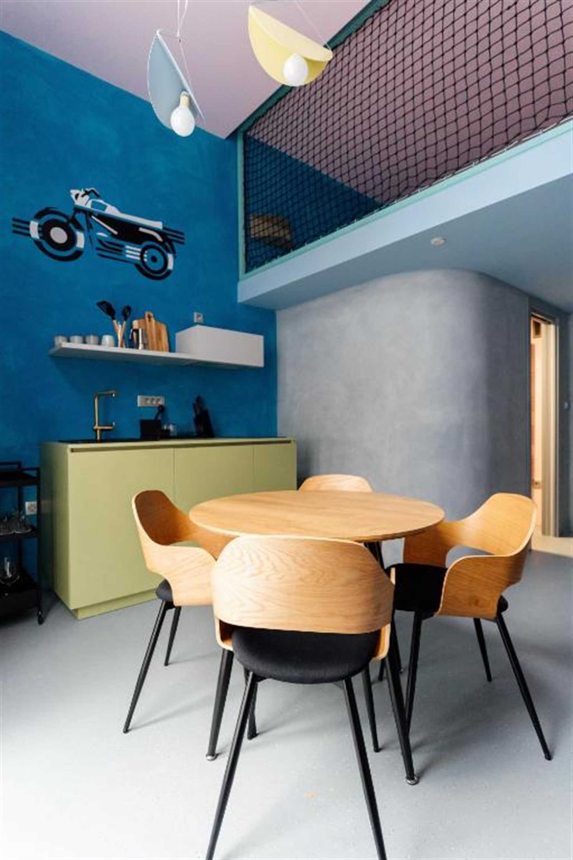 The apartment is 30 m2 and consists of a bedroom, a living area with a kitchenette and a dining area, and a bathroom. The bedroom is located on a raised platform accessed by stairs and is equipped with a double bed (180 x 200 cm). The living area includes a comfortable sofa and a flat-screen TV. The living room is connected to the kitchen and dining area, which provides everything needed for the preparation and serving of various dishes.