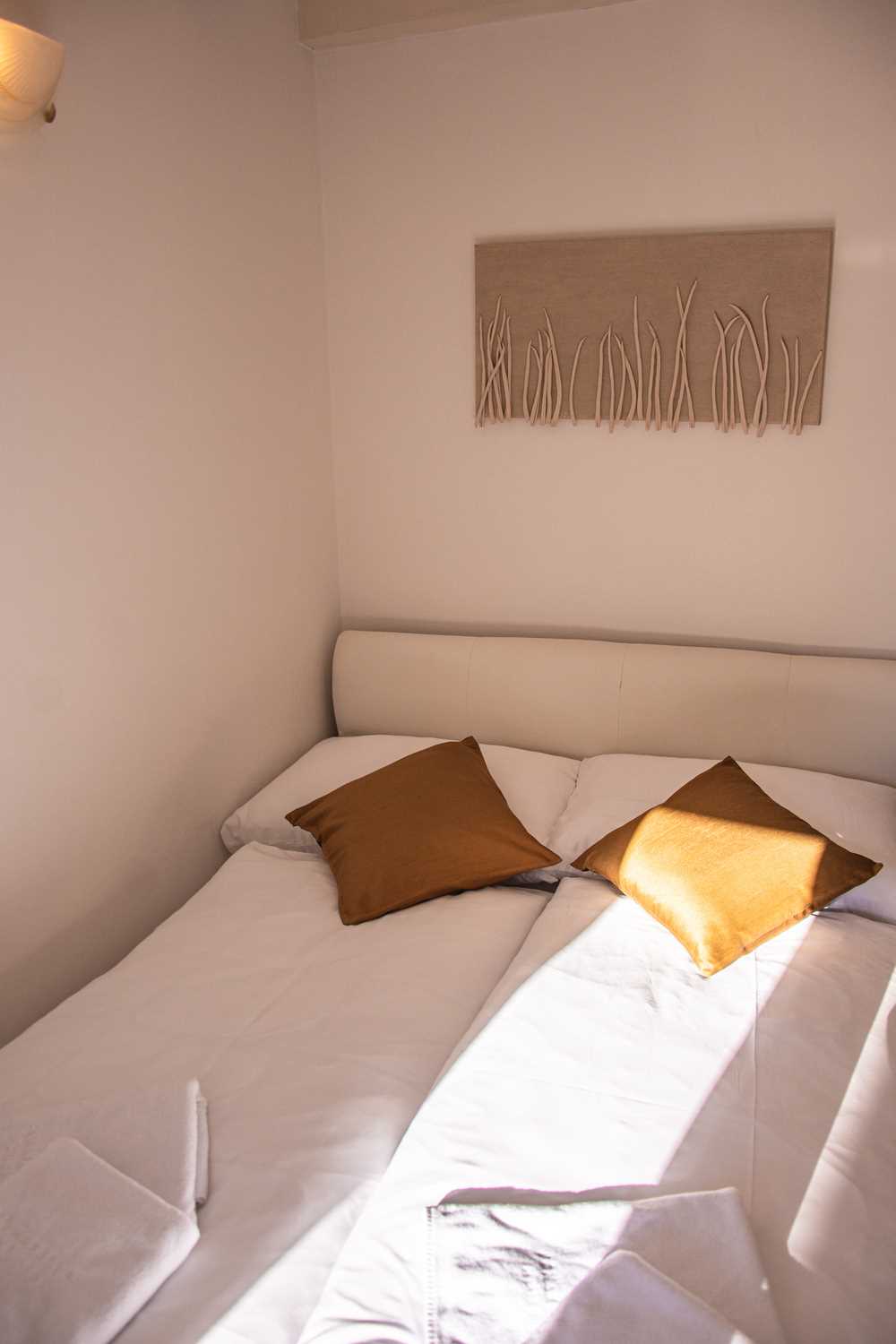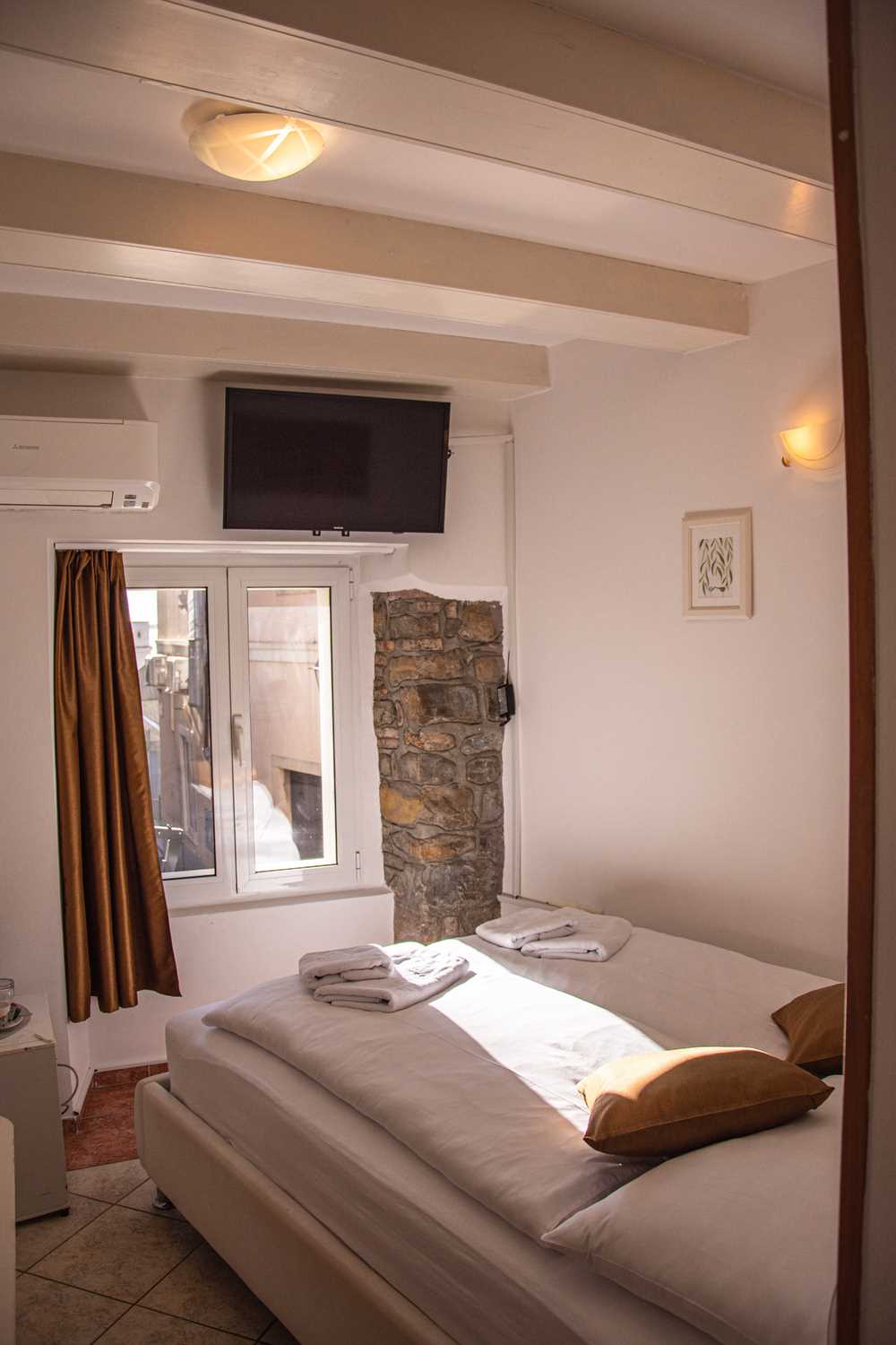 The air-conditioned room covers an area of 8 m2. The layout includes a bedroom and a private bathroom. The bedroom is equipped with a double bed (160×200 cm), a flat-screen TV, a refrigerator, and a coffee/tea maker. The bathroom features a shower cabin. The room contains gentle, light tones. One of the walls is decorated with istrian stone, creating a sense of home and warmth in the space. From the window, you can enjoy a view of the street.