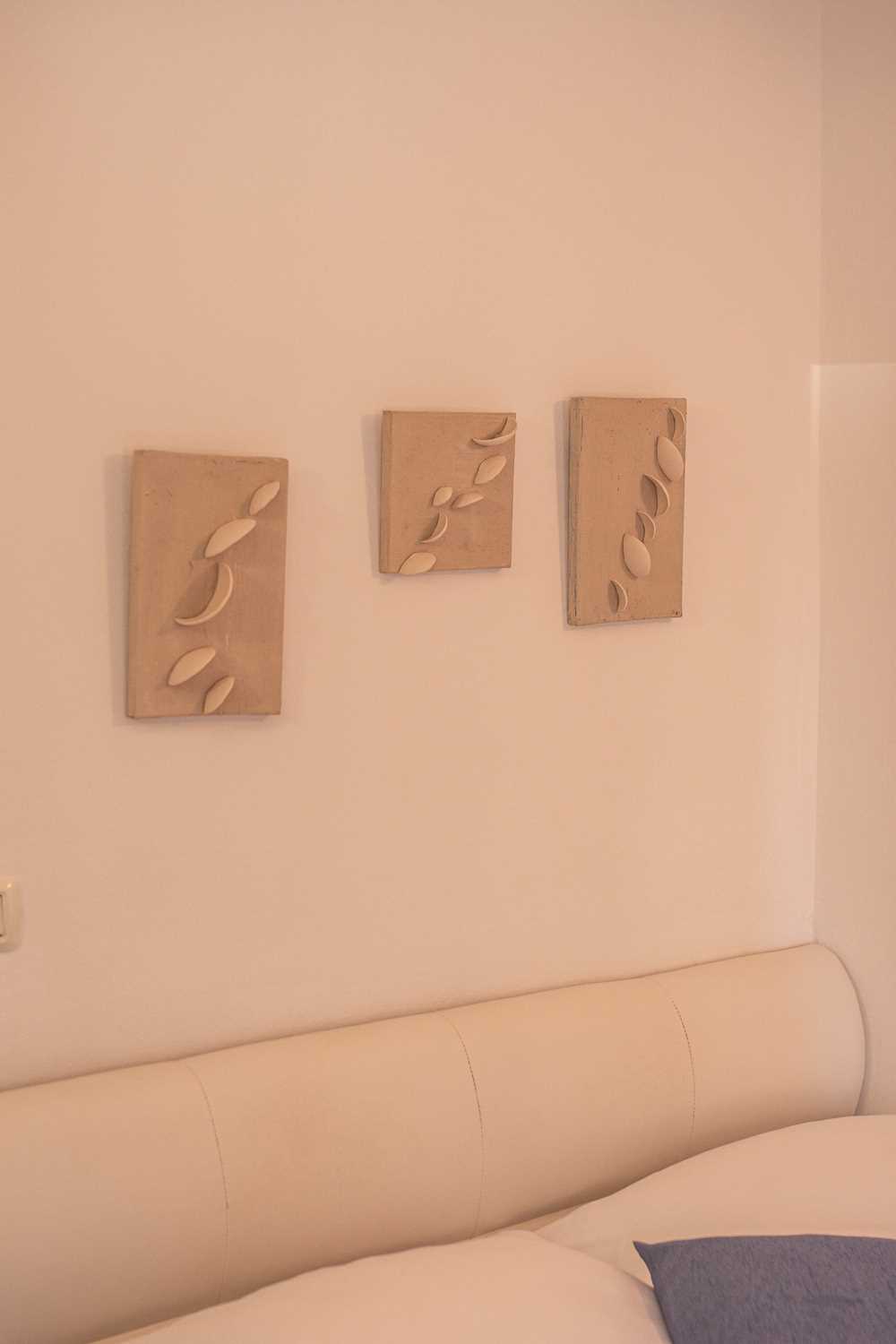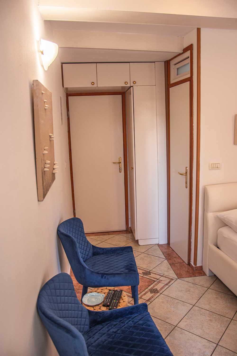 The air-conditioned room covers an area of 12 m2. The layout includes a bedroom and a private bathroom. The bedroom is equipped with a double bed (160×200 cm), a flat-screen TV, a small coffee table with chairs, a refrigerator, and a coffee/tea maker. The bathroom features a shower cabin. The room contains blue tones, which nicely blend into the mediterranean environment. Wall paintings further enhance the space.