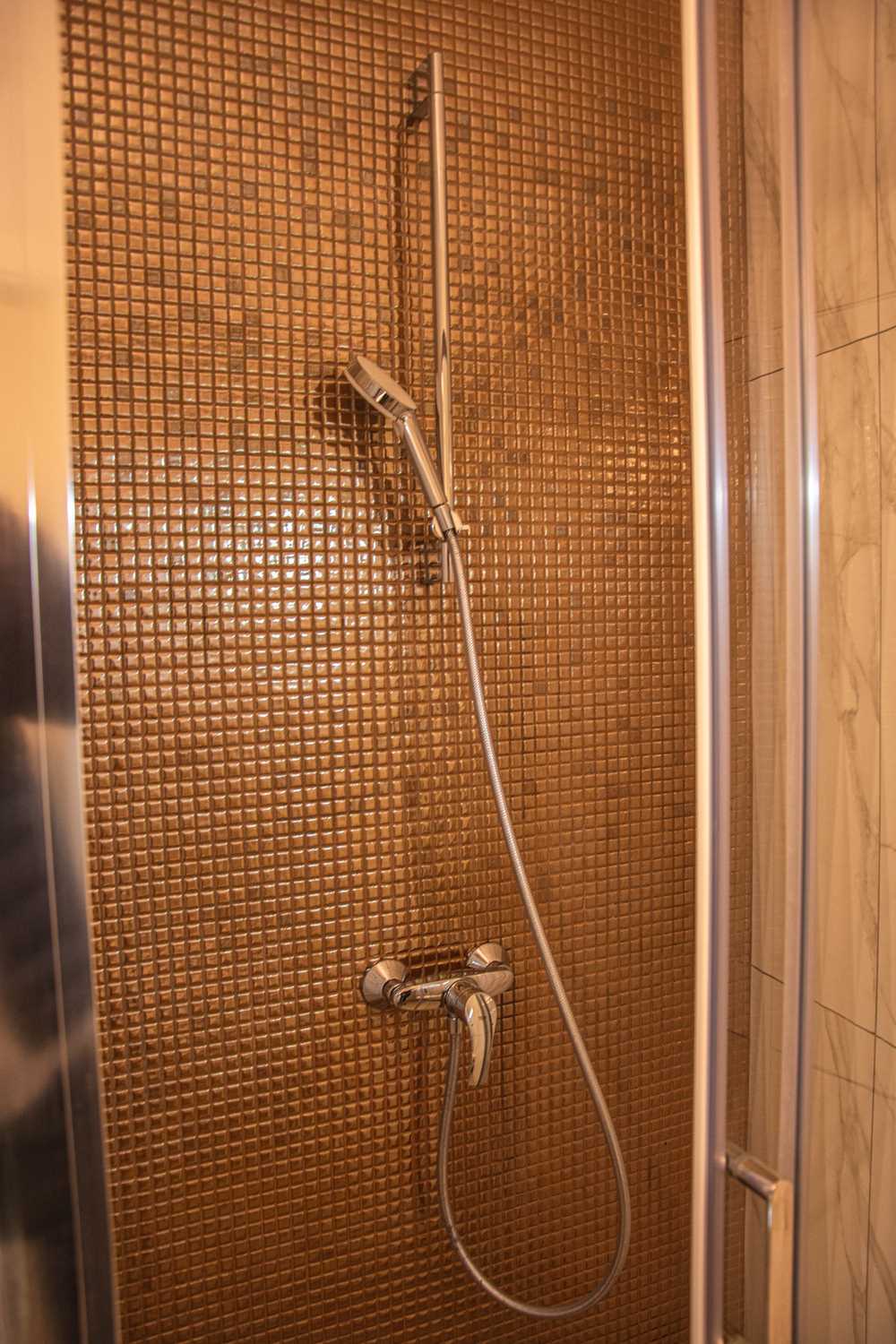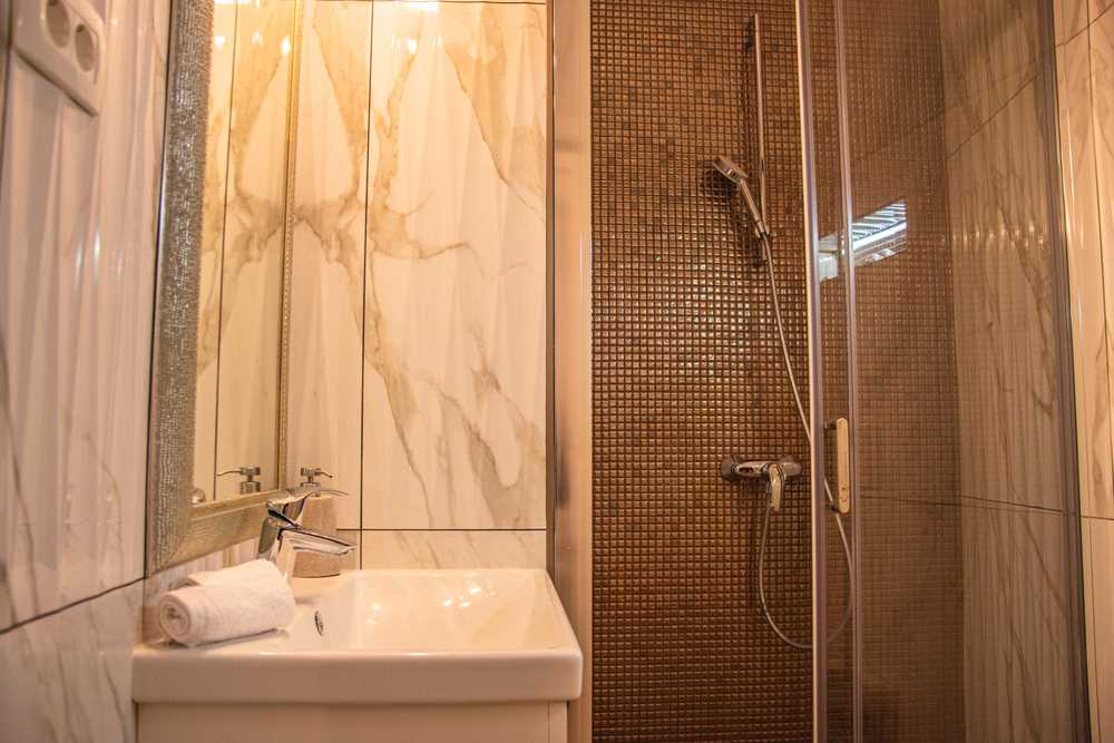 The air-conditioned room covers an area of 16 m2. The layout includes a bedroom and a private bathroom. The bedroom is equipped with a double bed (160×200 cm), a flat-screen TV, a small coffee table with chairs, a refrigerator, and a coffee/tea maker. The bathroom features a shower cabin. The room contains gentle, light tones, and the walls are decorated with artwork. The room is located on the ground floor of the building.